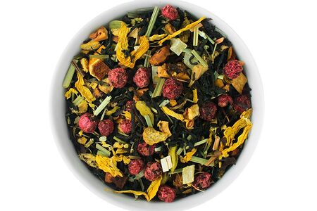 Купаж цейлонского, индийского и китайского черного чая, имбирь, цедра апельсина, лемонграсс, кусочки яблока, цукаты ананаса, кокос, ароматизатор, красная смородина, кардамон, подсолнечник