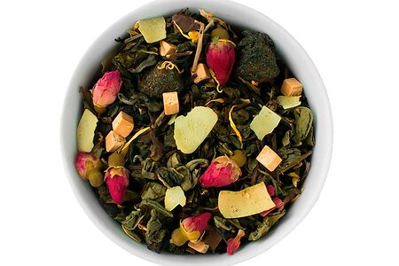 Купаж китайского белого чая Пай Му Тан и зеленого чая: Дарджилинг, Фог Ти, Лунг Чинг, Жемчужина дракона, сублимированная вишня, кокосовые чипсы, бутоны роз