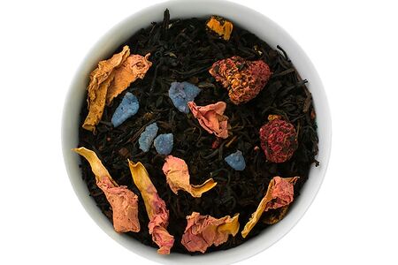 Чёрный чай, бузина, кусочки финика, ароматизатор, малина, лепестки розы, жасмин, ваниль, засахаренная фиалка, кусочки личи