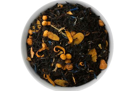 Индийский чёрный чай ассам, ароматизатор, кусочки белого шоколада, жареный карамелизированный миндаль, миндальные хлопья, кусочки сливы, василёк, цветы апельсина