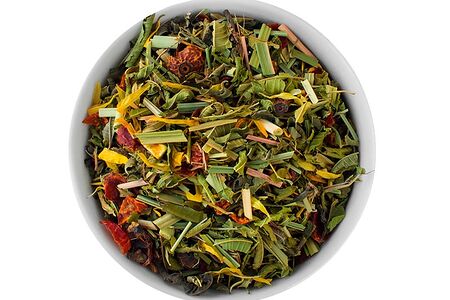 Чёрный чай декаф, лемонграсс, шиповник, листья мелиссы, цедра апельсина, натуральный ароматизатор, лепестки календулы и сафлора