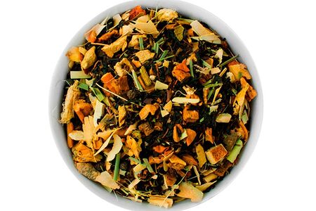 Чёрный чай, кусочки яблока, ройбос, имбирь, корочки бобовых, корица, ароматизатор, омела белая, лемонграсс, зверобой, черный перец, гвоздика, кардамон, корень женьшеня, цедра лимона