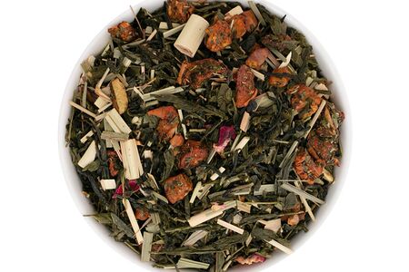 Зеленый чай, кусочки яблок, лемонграсс, ароматизатор, клубника, лепестки розы