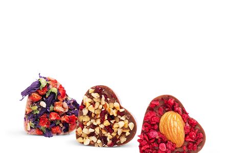 Признание с миндалем: молочный шоколад, ореховая паста из миндаля, малина сублимированная, арахис, вафельная крошка, Содержит орехи, молоко, сою. Может содержать следы продуктов, вызывающих аллергию. Признание с мальвой: белый шоколад, ореховая паста из миндаля, клубника сублимированная, соцветия мальвы. Содержит орехи, молоко, сою. Может содержать следы продуктов, вызывающих аллергию. Признание с фундуком и вишней: молочный шоколад, ореховая паста из фундука, фундук жареный дробленый, кокосовая стружка, вишня сублимированная. Содержит орехи, молоко, сою. Может содержать следы продуктов, вызывающих аллергию (3 шт.)