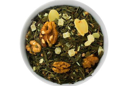 Китайский зелёный чай сенча, засахаренный фундук, грецкий орех, миндальные хлопья, цукаты ананаса и кокосовые чипсы, ароматизатор