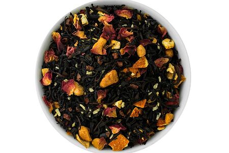 Индийский чёрный чай Ассам, кусочки какао, цедра апельсина, кокосовая стружка, жареный карамелизованный миндаль, ароматизатор, лепестки розы
