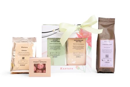 Стильная сумочка, внутри которой собрана коллекция напитков - три душистых чая и десертный сорт кофе, дополненные аппетитными драже ручной работы