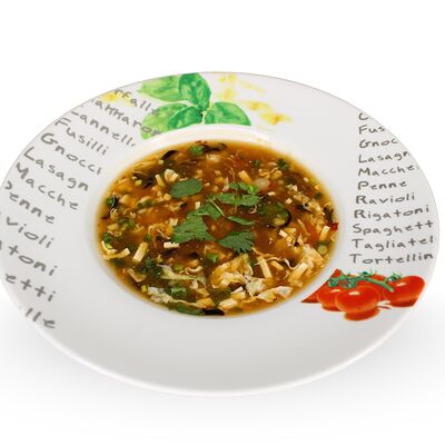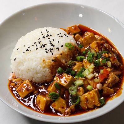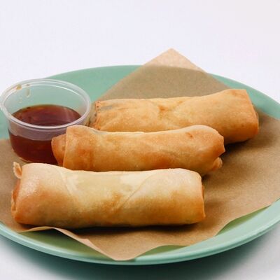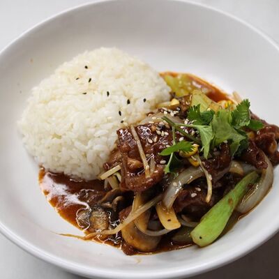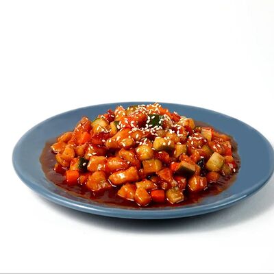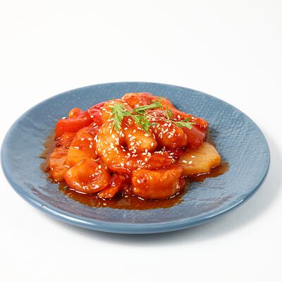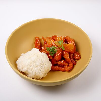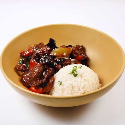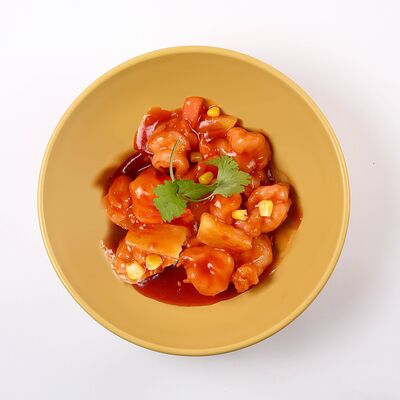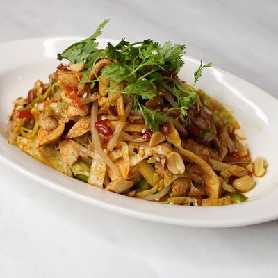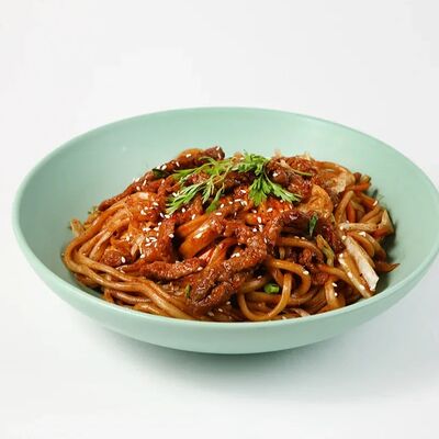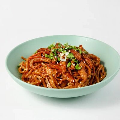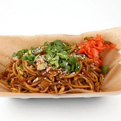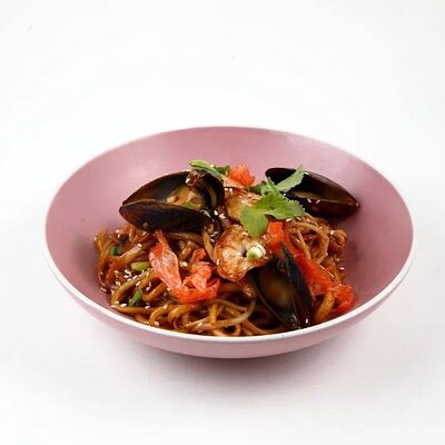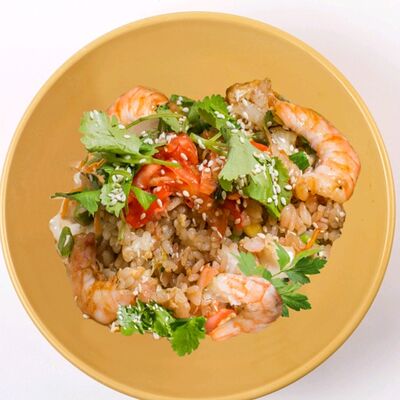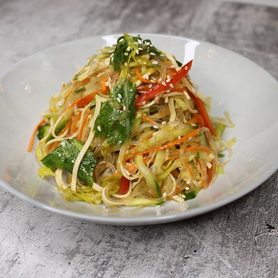 Обжаренная на воке рисовая лапша с креветками, морковью, капустой, зеленым луком и халапеньо