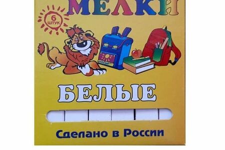 Мел белый средней твердости, в наборе 6 штук. Изготовлен из экологически чистых материалов, без примесей и добавок. Подходит для письма и рисования на различных поверхностях, не оставляет царапин и не крошится.Упаковка картонная коробка.