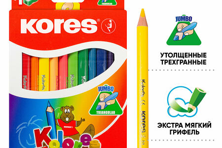 Карандаши цветные Kores деревянные, трехгранные, толщина грифеля 5 мм, 12 цветов + точилка доставка