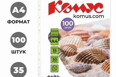 Файл-вкладыш 'Комус' формата А4, предназначенный для хранения и защиты печатных документов. Поверхность рифленая. Позволяет копировать документы, не вынимая их из папки. Изготовлен из полипропиленовой пленки (толщина 35 мкм). Боковая перфорация подходит для разных типов скоросшивателей. В упаковке содержится 100 файлов. Каждый файл-вкладыш вмещает около 50 листов стандартной плотности. Стоимость указана за упаковку. В рамках обновления дизайна упаковки с сохранением всех потребительских характеристик товара, допускается поставка данной продукции в двух вариантах дизайна упаковки.