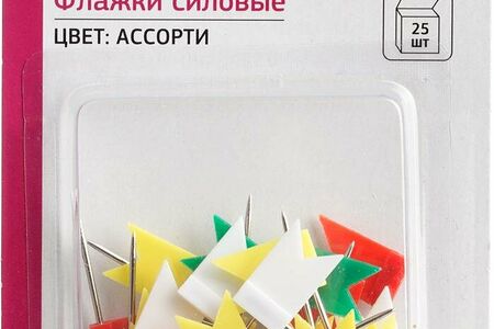 Кнопки-флажки силовые Attache предназначены для крепления информации на текстильных и пробковых досках. Шляпки кнопок в форме флажка выполнены из пластика, а основания в виде иголок из прочного металла. В упаковке содержится 25 кнопок с разноцветными шляпками. Кнопки флага: красные, синие, зеленые, желтые, белые (по каждом цвету 5 штук). Длина кнопки с флажком 33.5 мм, длина иглы без флажка 23.5 мм.