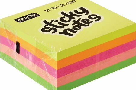 Стикеры Attache Selection Мини куб в формате 51 51 мм, состоят из 50 листов в каждом блоке (всего 250 листов). Стикеры из 5 неоновых цветов (желтый, розовый, зеленый, оранжевый, светло-розовый). Плотность бумаги: 75 г/кв.м. Клейкий слой 22 Н/м. Длина клейкой стороны 51 мм. Особых условий хранения не требует, сертификации не подлежит, срок годности не ограничен.Чтобы увеличить срок службы стикеров, пожалуйста, следуйте рекомендациям:1) Отделять стикер от блока следует вдоль клеевой полосы. Так можно избежать скручивания и последующего отклеивания стикера.2) Прежде чем наклеивать стикер, убедитесь в отсутствии грязи и пыли на поверхности. На чистой поверхности срок службы клеевого слоя более продолжителен.