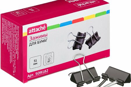 Металлические зажимы для бумаг Attache используются для скрепления документов без использования степлеров. Зажимы из металла с черным покрытием. Размер зажима: ширина 51 мм, высота 79 мм, глубина закладки 24 мм. Позволяет скреплять до 240 листов плотностью 80 г/кв.м, не деформируя при этом бумагу. Зажимы для бумаг поставляются по 12 штук в картонной упаковке.В транспортном коробе 20 упаковок.Зажимы мягко скрепляют большое количество листов, не оставляя следов после удаления и не повреждая бумагу.Для эффективного скрепления максимально допустимого объема листов бумаги необходимо, чтобы листы были собраны в ровную стопку без заломов, загибов и дефектов поверхности бумаги.