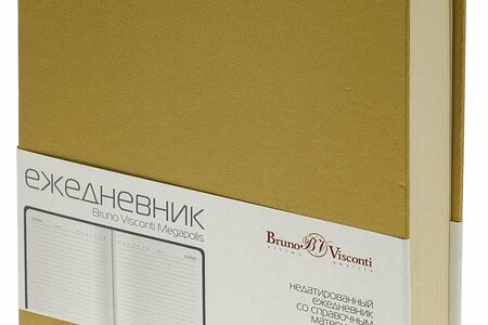 Ежедневник недатированный Bruno Visconti, цвет золотистый. Коллекция Megapolis. Формата А5, размер изделия 142 214 мм. Долговечный и практичный традиционный для канцелярской продукции переплетный материал с легким рельефом кожи. Обложка из искусственной кожи на бумажной основе, с закругленными уголками. Тип возможного тиснения фольгирование и шелкотрафаретная печать. На поверхность возможно горячее тиснение, подходит тиснение фольгой, особенно белой. Блок: недатированный, офсетная бумага бежевого цвета, плотностью 70-90 г/кв.м., 160 листов (320 страниц), размер блока 140 210 мм, печать блока в 1 цвет, удобная закладка-ленточка (ляссе) поможет быстро найти нужную страницу. Ежедневник имеет обширный справочный материал из 16 листов (32 страницы) личные данные, цифровые автомобильные коды,энергетическая и питательная ценность продуктов,