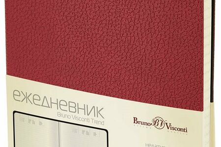 Ежедневник недатированный Bruno Visconti, цвет бордовый. Коллекция Trend. Формат А5, размер изделия 147 214 мм. Практичный и прочный переплетный материал это качественная имитация зернистой кожи. На матовую поверхность хорошо ложится тиснение. Заметным акцентом оформления является кожаная закладка-ляссе в тон обложке. Для ее фиксации использован контрастный шов белой нитью. Блок: недатированный, первосортная офсетная бумага тонируется в бежевый цвет, плотность не менее 70-90 г/кв.м., 136 листов (272 страницы). Внутри есть не только много места для текущих записей, но и обширный справочный раздел, алфавитная телефонная книга.