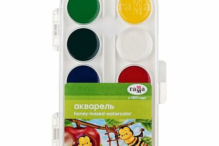 Акварельные медовые полусухие краски Гамма Пчелка , 10 цветов. В набор входит краска белого цвета. Краски в пластиковой коробке с европодвесом содержат стойкие и яркие пигменты, что позволяет получать насыщенные изображения с эффектом бархатистости цвета. Краски изготовлены с добавлением натуральной патоки и пчелиного меда. Кисточка в комплект не входит. Акварель отличается чистотой и прозрачностью тонов, легкостью получения новых оттенков (смешивание, наложение слоев друг на друга). Не токсична, легко смывается с рук и одежды. Размер упаковки (ДxШxВ): 180 90 20 мм. Объем краски одного цвета в кювете 3,5 куб.см.