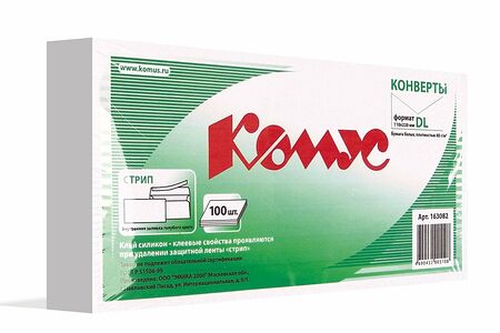 Конверт белый E65 стрип 110х220 80г КОМУС 100шт/уп 12уп/кор доставка