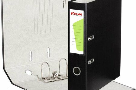 Папка-регистратор с арочным механизмом 'Комус' подходит для хранения документов в большом количестве. Формат А4. Изготовлена из плотного картона, покрытого бумвинилом черного цвета. Внутренняя вклейка бумажная. Арочный механизм произведен в Чехии. Нижние края папки защищены от повреждений металлическим кантом. На корешке шириной 75 мм имеется карман со сменной этикеткой и кольцо для захвата. Благодаря прорезям для колец на внешней крышке папка-регистратор 'Комус' остается закрытой даже при большом количестве бумаг. Размер кармана на корешке папки может быть разным, в зависимости от производителя папок.Цвет папки может быть насыщенным, либо более светлым в зависимости от производителя папок.Высота папки может отличаться в зависимости от производителя. Размеры могут быть 317х285х75 мм или 320х285х75 мм.