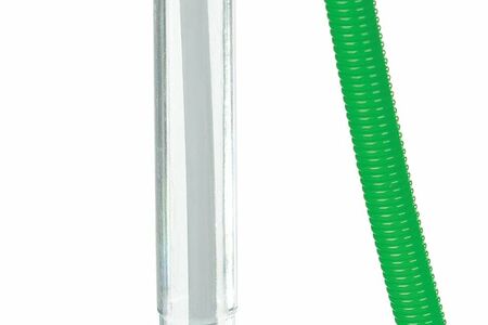 Шариковая ручка на подставке с синим цветом чернил. Модель представлена в пластиковом прозрачном корпусе с элементами зеленого цвета. Изделие прикреплено к подставке с помощью резинового шнура-пружины. Благодаря липкому слою на основании подставка может быть жестко зафиксирована практически на любой ровной поверхности. При письме стержень, оснащенный шариком, оставляет линию, толщина которой составляет 0,35 мм. Возможна замена стержня. Удобна для использования в офисах и различных учреждениях. Диаметр шарика 0,5 мм.