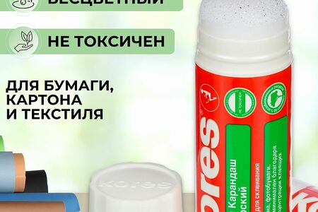 Клей-карандаш для бумаги и поделок от бренда Kores. Клей-карандаш предназначен для склеивания бумаги, картона, текстиля. Основа клея обладает мягкой структурой и содержит глицерин для легкого скольжения. С помощью клея-карандаша можно зафиксировать текстиль на бумаге. Ткань к ткани лучше не прикреплять, так как клей смывается и отстирывается водой. Не имеет запаха. Простой и удобный механизм, расположенный в основании стержня, позволяет легко выкрутить и закрутить столбик клея. Вес - 40 г. Форма корпуса: круглая. Не содержит цветовых пигментов (бесцветный). Нетоксичен и экологичен, безопасен для детей. Клей начинает действовать через 30 секунд после нанесения. Характерной особенностью является возможное выделение глицериновых капель на поверхности данного клея, что придает легкость скольжения и возможность легкого нанесения клея на бумагу, тем самым обеспечивая экономичное расходование клея. Клей карандаш идеально подходит для офиса, дома и школы, гарантирует надежное склеивание бумаги, не оставляет следов.