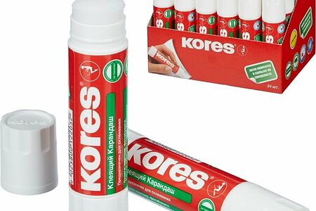 Клей-карандаш Kores предназначен для склеивания бумаги, картона, текстиля. Основа клея обладает мягкой структурой и содержит глицерин для легкого скольжения. Без цветовых пигментов (бесцветный).С помощьюклея-карандаша можно зафиксировать текстиль на бумаге. Ткань к ткани лучше не прикреплять, так как клей смывается и отстирывается водой. Не имеет запаха. Вес 20 г. Форма корпуса: круглая. Простой и удобный механизм, расположенный в основании стержня, позволяет легко выкрутить и закрутить столбик клея. Начинает действовать через 30 секунд после нанесения. Нетоксичен и экологичен, безопасен для детей. Характерной особенностью является возможное выделение глицериновых капель на поверхности данного клея, что придает легкость скольжения и возможность легкого нанесения клея на бумагу, тем самым обеспечивая экономичное расходование клея.