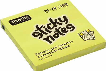 Стикеры Attache Selection в формате 76 76 мм, желтого цвета, 100 листов. Идеально подойдут для сотрудников творческих профессий и руководителей: рекомендуются для использования в процессе совещаний, обучения, мозговых штурмов. Тон стикеров неоновый. Плотность бумаги: 75 80 г/кв.м. клейкий слой 22 Н/м. Длина клейкой стороны 76 мм. После удаления бумаги на поверхности не остается следов клеевого состава, лист можно крепить повторно. Особых условий хранения не требует, сертификации не подлежит, срок годности не ограничен.Чтобы увеличить срок службы стикеров, пожалуйста, следуйте рекомендациям:1) Отделять стикер от блока следует вдоль клеевой полосы. Так можно избежать скручивания и последующего отклеивания стикера.2) Прежде чем наклеивать стикер, убедитесь в отсутствии грязи и пыли на поверхности. На чистой поверхности срок службы клеевого