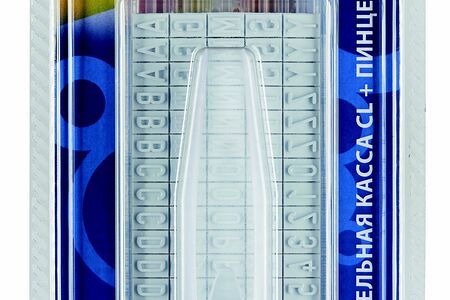 Касса TypeSet CL/P латинских букв, цифр, символов большого шрифта для самонаборных штампов и датеров Colop + пинцет. В состав кассы входит 90 элементов (количество букв и цифр 88; количество символов 2), высота шрифта 6 мм. Набор текста производится в зеркальном отображении (справа налево). Каждый элемент кассы при помощи пинцета крепится на две ножки в первую и вторую строки штампа количество строк текста, набранных знаками из кассы большого шрифта, в два раза меньше, чем изначально в штампе. Расходный материал Colop подходит только для продукции Colop.