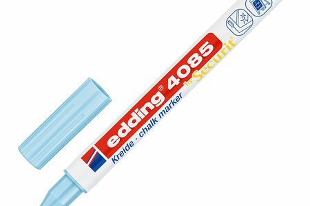 Меловой маркер edding 4085. Цвет пастельный голубой. Предназначен для нанесения рисунков и надписей на гладкие поверхности, такие как стекло, кафель, пластик, меловые доски (в том числе черные). Легко стираются влажной салфеткой.Чернила этого маркера ни что иное как жидкий мел на водной основе без каких-либо примесей, поэтому данный маркер прекрасно подходит для детей. Edding 4085 отличный инструмент для воплощения творческих идей дома, но так же рекомендуется для использования в офисах, ресторанах, стекольной и других видах промышленности.Уникальная особенность серии edding 4085 наличие необычных цветов и тонкая линия письма всего 1 2 мм, что является большой редкостью для меловых маркеров. Форма наконечника: круглая. Перед использованием маркера требуется произвести его активацию в соответствии с инструкцией.