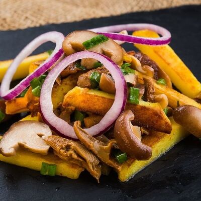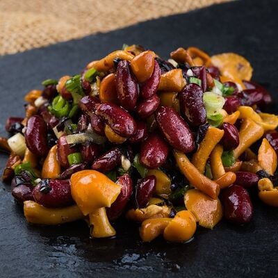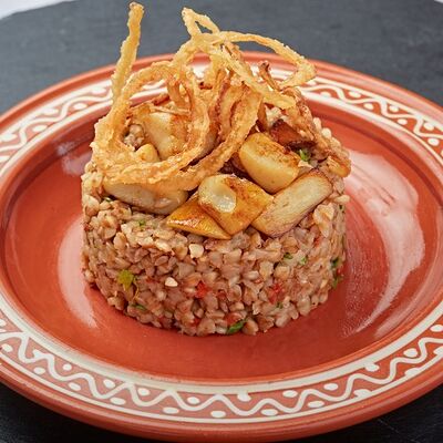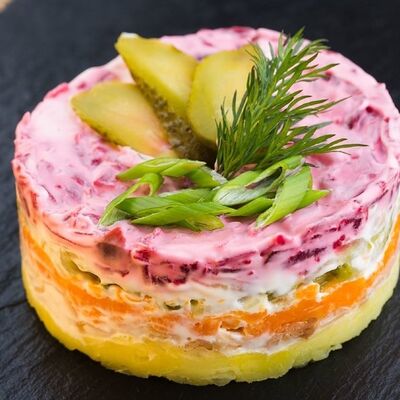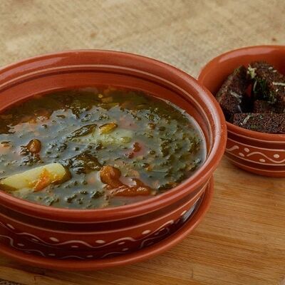 Говядина, бекон, колбаски охотничьи, сосиски копченые, каперсы, огурцы соленые, лук, паприка, оливки, маслины. Подаётся со сметаной
