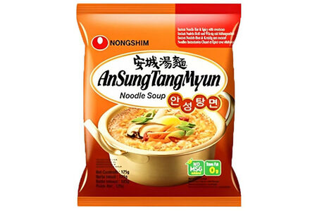 Настоящая корейская лапша быстрого приготовления AnSungTangMyun от Nongshim – лучший способ превратить суп в кулинарный шедевр. Тонкая, длинная, эластичная, она не разваривается и не теряет форму, а время варки составляет всего 3-5 минут. Состав: лапша - пшеничная мука, картофельный крахмал, пальмовое масло, рисовая мука, клейковина пшеницы, соль, регуляторы кислотности: E501, Е500, E339, жидкий пищевой антиоксидант: Е306, эмульгатор: Е322 (содержит сою), стабилизатор: Е412, специи (мальтодекстрин, экстракт чеснока, эмульгатор: Е420), экстракт зеленого чая (олигосахариды, чайный катехин, регулятор кислотности: лимонная кислота Е 330), пищевой краситель: Е101, бульон-приправа: специи (гидролизированный растительный белок, мальтодекстрин, соль, дрожжевой экстракт, черный перец, грибы), соль, сахар, специи (красный перец чили, чеснок, масло коричневого риса, черный перец), сушеные водоросли, усилитель вкуса и аромата (Е631, Е627), сушеный красный перец чили, карамельная пудра ( мальтодекстрин, пищевой краситель Е150с). Энергетическая и пищевая ценность на 100 г: 423 ккал, белки 8.2 г, жиры 14 г, углеводы 66 г. Срок хранения: 12 месяцев. Способ приготовления: выложить в чашку лапшу и содержимое пакетика. Залейте 550 мл горячей воды, готовьте в микроволновке 4 минуты, либо на плите в кастрюле 5 минут.
