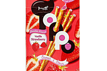 Тонкие бисквитные трубочки из хрустящего несладкого печенья, заполненные шоколадом со вкусом клубники. В коробке 2 отдельных герметичных пакета с палочками. Состав: пальмовое масло, рапсовое масло, сахар, лактоза, сухое молоко, обезжиренное молоко, мальтодекстрин, эмульгатор, пшеничная мука, кукурузный крахмал, шортенинг, эмульгатор, антиоксидант, соль, солодовый экстракт, разрыхлитель, ароматизатор (клубничный, ванильный), регулятор кислотности. Энергетическая и пищевая ценность на 100 г: 519 ккал, белки 4.7 г, жиры 27.2 г, углеводы 63.8 г.