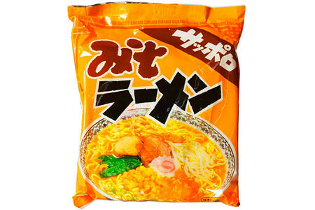 Лапша быстрого приготовления с бульоном из мисо-пасты Sapporo Miso Ramen от Sunaoshi. Состав: мука пшеничная, пальмовое масло, соль, приправа сухая (соль, мисо в порошке (соя, соль), сахар, экстракт специй, соус соевый в порошке (соя, соль, пшеница), дрожжевой экстракт, пальмовое масло, лук-порей), крахмал картофельный модифицированный, усилитель вкуса глутамат натрия Е621, загущающие полисахариды, красители (карамель Е150, гардения), антиоксиданты (витамин Е), щелочная вода (карбонат натрия Е500i, карбонат калия Е501i, ортофосфат натрия однозамещенный Е339i), экстракт специй. Пищевая и энергетическая ценность на 84 г продукта: 362 ккал/1516 кДж, белки 8 г, жиры 14,9 г, углеводы 48,9 г. Срок годности: 8 месяцев. Способ приготовления: в кипящую воду (450 мл на порцию) опустить лапшу и варить её, слегка помешивая, 3 мин. Растворить в этой воде сухую приправу после выключения огня. При желании сервировать тонко нарезанной вареной свининой, луком-пореем, вареными ростками сои и т.д.