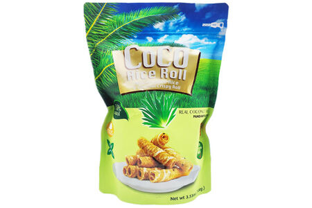 Кокосовые снек из Таиланда. Сладкая трубочка из кокоса и риса со вкусом пандана. Пандан - тропическое растение, используемое в десертах, имеет сладковатый, ванильный вкус. Состав: кокосовое молоко, тайский рис жасмин, кокосовый сироп (кокосовый сахар, вода, соль), сахар, жареный кунжут, ароматизатор пандана. Пищевая и энергетическая ценность на 100 г продукта: 453 ккал/1896 кДж, белки 3,3 г, жиры 15 г, углеводы 77 г. Срок годности: 12 месяцев.