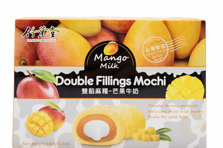 Набор моти Bamboo House Double Fillings Mochi с двойнкой начинкой из молока и манго. Состав: мальтоза, сахар, клейкий рис, пектин, желатин, сливки, манго, сорбитол, ароматизатор, сорбиновая кислота. Пищевая и энергетическая ценность на 100 г продукта: 361 ккал, белки 0,6 г, жиры 2,5 г, углеводы 84,3 г, натрий 17 мг. Срок годности: 10 месяцев.