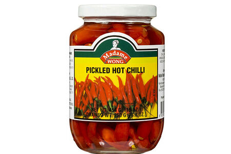 Маринованный красный перец чили от Madame Wong без добавления искусственных красителей и консервантов. Острый перец чили придаёт вкус многим блюдам и может использоваться в качестве приправы. Состав: вода, перец чили, консерванты (уксусная кислота (E260), Бензоат натрия (E211), метабисульфит натрия (E223)). Пищевая и энергетическая ценность на 100 г продукта: 66,64 ккал, белки 3,3 г, жиры 11,5 г, углеводы 6,7 г. Срок годности: 24 месяца.