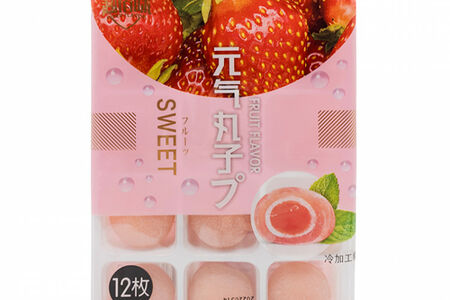 Фруктовые моти со вкусом клубники. Состав: мальтозный сироп, крахмал, клубничный джем (10%), питьевая вода, клейкий рис, белый сахар, гидрогенизированное кокосовое масло (содержит сорбат калия), пищевые добавки (жидкий сорбит, альгинат натрия, моностеарат глицерина), DL-яблочная кислота, пищевые добавки (дегидроацетат натрия, свекла), пищевые ароматизаторы. Пищевая и энергетическая ценность на 100 г продукта: 1437 кДж, белки 0,9 г, жиры 2 г, углеводы 79,3 г, натрий 164 мг. Срок годности: 8 месяцев.