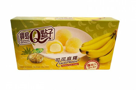 Моти - традиционные японские пирожные из клейкой рисовой муки. Чаще всего продаются с начинкой из фруктов или ягод, бобов адзуки и пасты с зеленым чаем матча. Эти моти сильно отличаются от традиционных по форме, вкусу и начинки. Состав: мальтоза, сахар, молочная начинка: растительное масло (пальмовое масло, соевое масло), сахар, сухое цельное молоко, лактоза, какао-масло, эмульгатор соевый лецитин (Е322), эмульгатор (Е471), ароматизатор, соль, ароматизатор ванилин; мука из клейкого риса, загуститель (Е1442), трегалоза, пальмовое масло, банановый экстракт, соль, картофельный крахмал, ароматизатор, краситель каротин (Е160а), консервант сорбат калия (Е202). Может содержать следы арахиса, глютена, кунжута и орехов. Информация об аллергенах: содержит молоко, соевые бобы. Условия хранения: при температуре от +2°С до +25°С и относительной влажности воздуха не более 75%. После вскрытия хранить в холодильнике не более 7 дней. Энергетическая и пищевая ценность на 100 г: 360 ккал, белки - 1.2 г, жиры - 6.2 г, углеводы - 74.9 г.