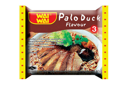 Лапша быстрого приготовления со вкусом утки Palo Duck Flavour от WaiWai. Состав: лапша: мука пшеничная, растительное (пальмовое) масло, крахмал тапиоки, соль, вода, усилитель вкуса (Е621), регулятор кислотности (Е500 (ii)), кунжутное масло, Е452 (i), ароматизатор идентичный натуральному (курица); порошок-приправа: сахар, соль, ароматизатор идентичный натуральному - приправа для утки Пало, усилитель вкуса (Е621), мальтодекстрин, сушеный зеленый лук, диоксид кремния; пряное масло: растительное (пальмовое) масло, чеснок; чили: чили.*продукт может содержать следы: креветок, яиц, рыбы, молока, сельдерея. Не содержит искусственных красителей. Пищевая и энергетическая ценность на 100 г продукта: 456 ккал, белки 10,3 г, жиры 19,7 г, углеводы 59,4 г. Срок годности: не более 14 месяцев.