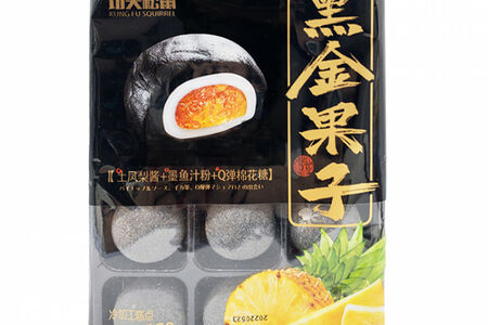 Моти со вкусом ананаса. Состав: мальтозный сироп, крахмал, ананасовая паста, клейкий рис, зефир, питьевая вода, белый сахар, порошок сока каракатицы (сок каракатицы, гуммиарабик, мальтодекстрин), гидрогенизированное кокосовое масло (содержащее сорбат калия), пищевые добавки (жидкий сорбит, альгинат натрия, моностеарат глицерина, DL-яблочная кислота, дегидроацетат натрия), пищевой ароматизатор. Пищевая и энергетическая ценность на 100 г продукта: 1463 кДж, белки 1,1 г, жиры 3,6 г, углеводы 77,1 г, натрий 126 мг. Срок годности: 8 месяцев.
