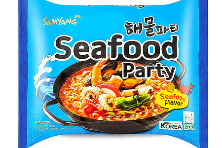 Лапша б/п со вкусом морепродуктов Samyang. Корейская лапша быстрого приготовления «Рамен» от компании Самьянг — это настоящий корейский суп-лапша. Он имеет острый и пикантный вкус и отличается качественной упругой лапшой. Состав: лапша (88.2%) - пшеничная мука, рафинированное пальмовое масло, модифицированный крахмал тапиоки, модифицированный картофельный крахмал, соль, соевое масло, сахарный сироп, подсластитель (Е420), эмульгатор (E322, Е452, Е450), регулятор кислотности (Е501, Е500, Е339, E330), загуститель (Е412), краситель (Е101), масло с ароматом зеленого чая; приправа (10 %) – соль, морепродукты (порошок кальмара (моллюски), гидролизованный растительный белок (соя, кукуруза, пшеница), порошок омара (ракообразный), порошок экстракта устриц (моллюски), порошок пикантной приправы, порошок экстракта анчоуса (рыбы), порошок экстракта креветок (моллюсков)), сахар, усилитель вкуса (Е621,Е631, Е627) рисовый порошок, пальмовое масло, острые специи (чесночный порошок, черный перец молотый, луковый порошок), краситель (Е160с), олеорезин капсикум; специи (1.8 %) – сушеные овощи (капуста, морковь, зеленый лук), сублимированный кальмар (моллюски), сушеная морская капуста. Пищевая и энергетическая ценность на 100 г продукта: 424 ккал/1774 кДж, белки 9,6 г, жиры 7,2 г, углеводы 64 г Способ приготовления: 1. Выложите лапшу в небольшую кастрюлю, добавьте приправу и сухих овощей и специй из пакетика и налейте пол-литра кипящей воды. 2. Варите на медленном огне в течение 3-4 минут. 3. Перемешивайте лапшу во время варки, и тогда она будет более упругой и вкусной. 4. Добавьте зелень, ветчину или ломтики сыра по вкусу.