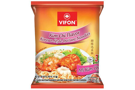 Лапша быстрого приготовления Vifon из Вьетнама со вкусом корейского кимчи. Тонкая пшеничная лапша в корейском стиле - отличный способ вкусно и быстро пообедать, для любителей острого. Состав: лапша: пшеничная мука, пальмовое масло, крахмал тапиоки, картофельный крахмал, соль, сахар, стабилизаторы (гуаровая камедь, трифосфаты), разрыхлители (карбонат калия, карбонат натрия), куркума; базовый суп-пакет: соль, сахар, усилитель вкуса и аромата (глутамат натрия, гуниалат натрия,инозинат натрия); сушеные овощи: капуста, лук-порей, морковь, мальтодекстрин, искусственный ароматизатор Кимчи, красный перец чили, чеснок, имбирь, чили, гуаровая камедь, лимонная кислота, натуральный краситель каротин, антиоксидант. Информация об аллергенах: содержит сою, пшеницу, молоко, грибы. Может содержать следы морепродуктов и арахиса. Энергетическая и пищевая ценность на 100 г: 430 ккал/1805 кДж, белки 7,7 г, жиры 19 г, углеводы 57,1 г. Срок хранения: 24 месяца.