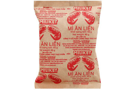 Сочная лапша с креветками Miliket. Полноценный обед, не требующий варки. Состав: лапша: пшеничная мука, тапиоковый крахмал, соль, сахар, стабилизатор (карбонат калия (501(i)), дигидрофосфат натрия (339(i)), тетрадифосфат натрия (450(iii)), пентанатрий трифосфат (451(i)), натрий полифосфат (452(i)), натрий карбоксиметилцеллюлоза (466)), пористое вещество (натрий карбонат (500(i))), натуральный краситель (бета-каротин) 160a(ii)), живица паприка (160c(i)), куркумин (100(i))), порошок из креветок, антиоксиданты (BHT (321)); приправа: соль, сахар, усилитель вкуса (мононатрий L-глутамат (621), 5'-гуанилат динатрия (627), динатрий 5'-инозинат (631)), приправа (лук, маниока, чеснок, перец чили), ароматизатор, креветочный ароматизатор. Энергетическая и пищевая ценность на 100 г: 253 ккал/1058 кДж, белки 5,9 г, жиры 15 г, углеводы 32,5 г. Срок хранения: 12 месяцев. Способ приготовления: засыпьте лапшу приправой, налейте примерно 300 мл кипятка. Накройте крышкой и подождите 3 минуты.