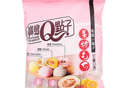 Эти моти сильно отличаются от традиционных из-за трех основных отличий: форма, вкус и начинка. Данные моти со вкусом фруктового ассорти (дыня, апельсин, клубника).