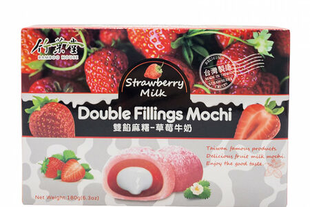 Набор моти Bamboo House Double Fillings Mochi с двойнкой начинкой из молока и клубники. Состав: мальтоза, сахар, клейкий рис, пектин, желатин, сливки, манго, сорбитол, ароматизатор, сорбиновая кислота. Пищевая и энергетическая ценность на 100 г продукта: 362 ккал, белки 0,5 г, жиры 2,8 г, углеводы 85 г, натрий 17 мг. Срок годности: 10 месяцев.