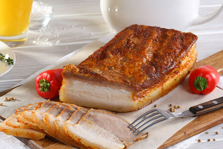 Приготовлен ремесленным способом из свиной грудинки с тонкими прослойками сала, а благодаря сложной технологии посола этот бекон имеет мягкую корочку и нежное мясо с оттенком пряного тмина.