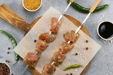Шашлык в маринаде из соевого соуса и дижонской горчицы с добавлением специй и пряных трав по авторской рецептуре МясновЪ. Соевый соус, дижонская горчица и оливковое масло делают мясо необычайно сочным и закладывают основу пикантного вкуса и ароматики, а восхитительный букет специй и трав — кинза, базилик, орегано, лук, петрушка и черный перец — придают шашлыку действительно невероятный аромат!