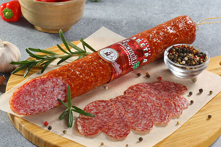 Сырокопчёная колбаса мелкого помола из говядины и свинины с добавлением шпика, с «частым» жирком, равномерно распределенным на срезе. Великолепный аромат копчения дополнен оттенками пряностей – чесночка, черного перца и паприки. Вкус насыщенный мясной и одновременно нежный.