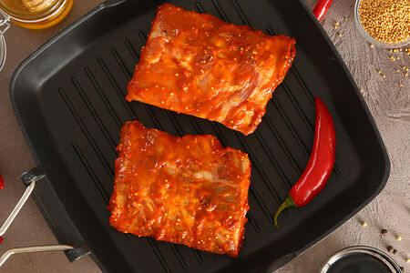 Ребрышки с ощутимой прослойкой нежного мяса, пряные, с «остринкой» и сладковатыми нотками. Эти оттенки вкус гармонично сочетаются между собой благодаря удивительному маринаду из оливкового масла, томатов, соусов Вустерширского и Табаско, мёда и специй.