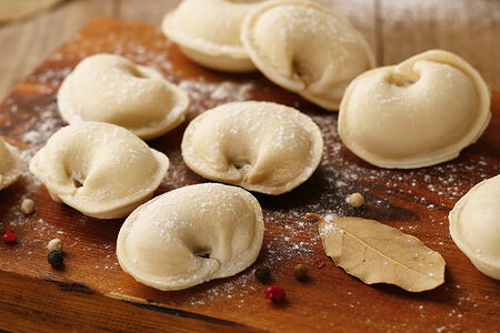В начинку добавляем говядину с тонкими жировыми прослойками — так пельмени получаются сочными, а бульон наваристым и золотистым. Тесто замешиваем из муки высшего сорта с яйцом и подсолнечным маслом: оно не пресное на вкус, плотное, эластичное и упругое. Такие пельмешки не растрескаются при заморозке и не разварятся.